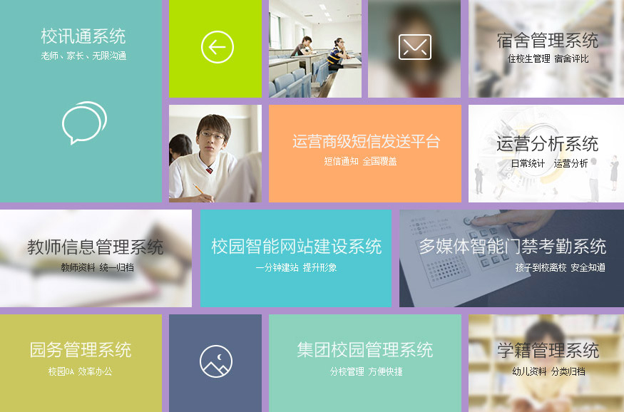 校园门禁,家校互动,师生信息管理,教学教务管理,报表分析系统,校车/车辆管理,访客登记,智能消费,宿舍管理,图书馆进出,宿舍管理等模块,全方位解决学校的各项管理问题;